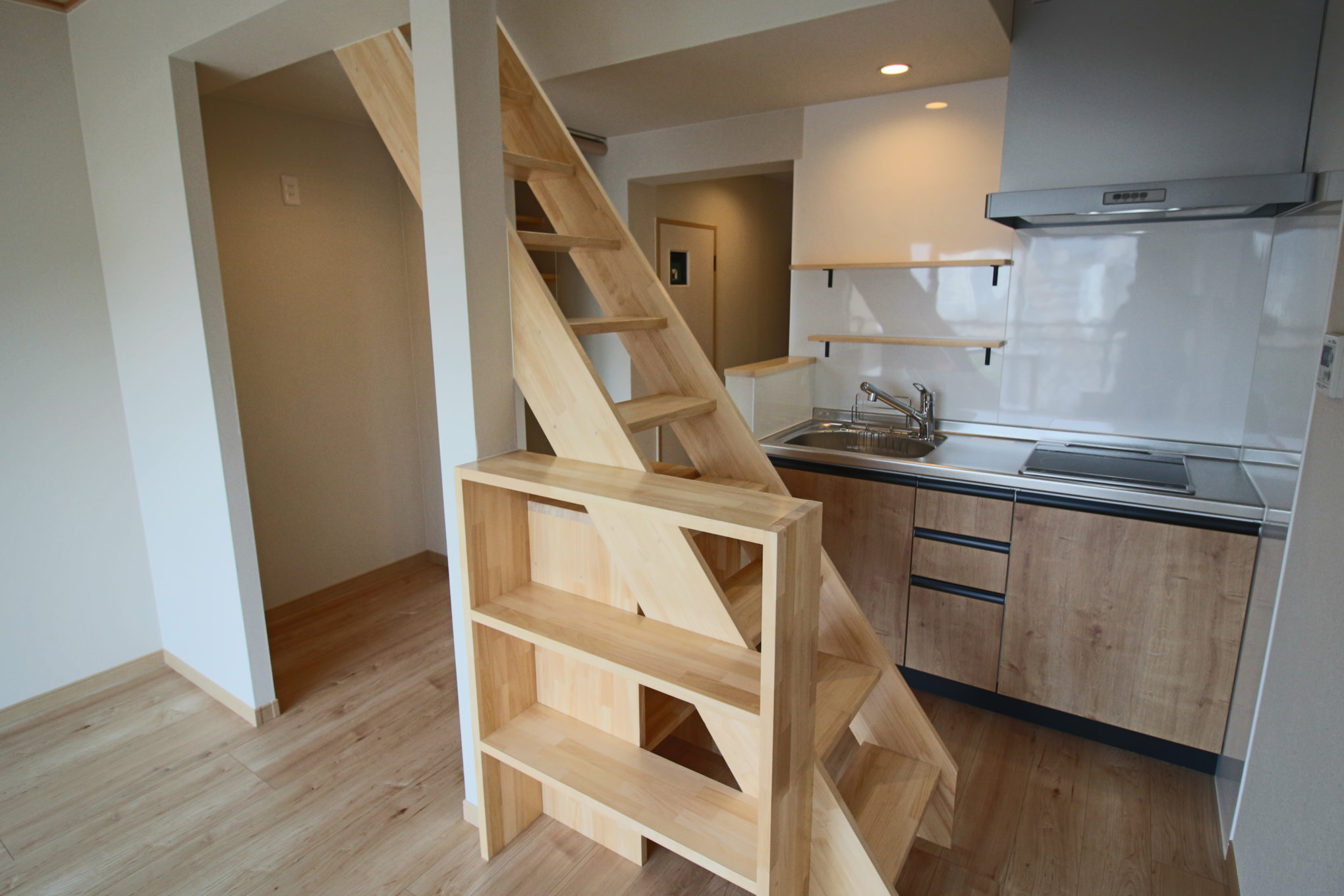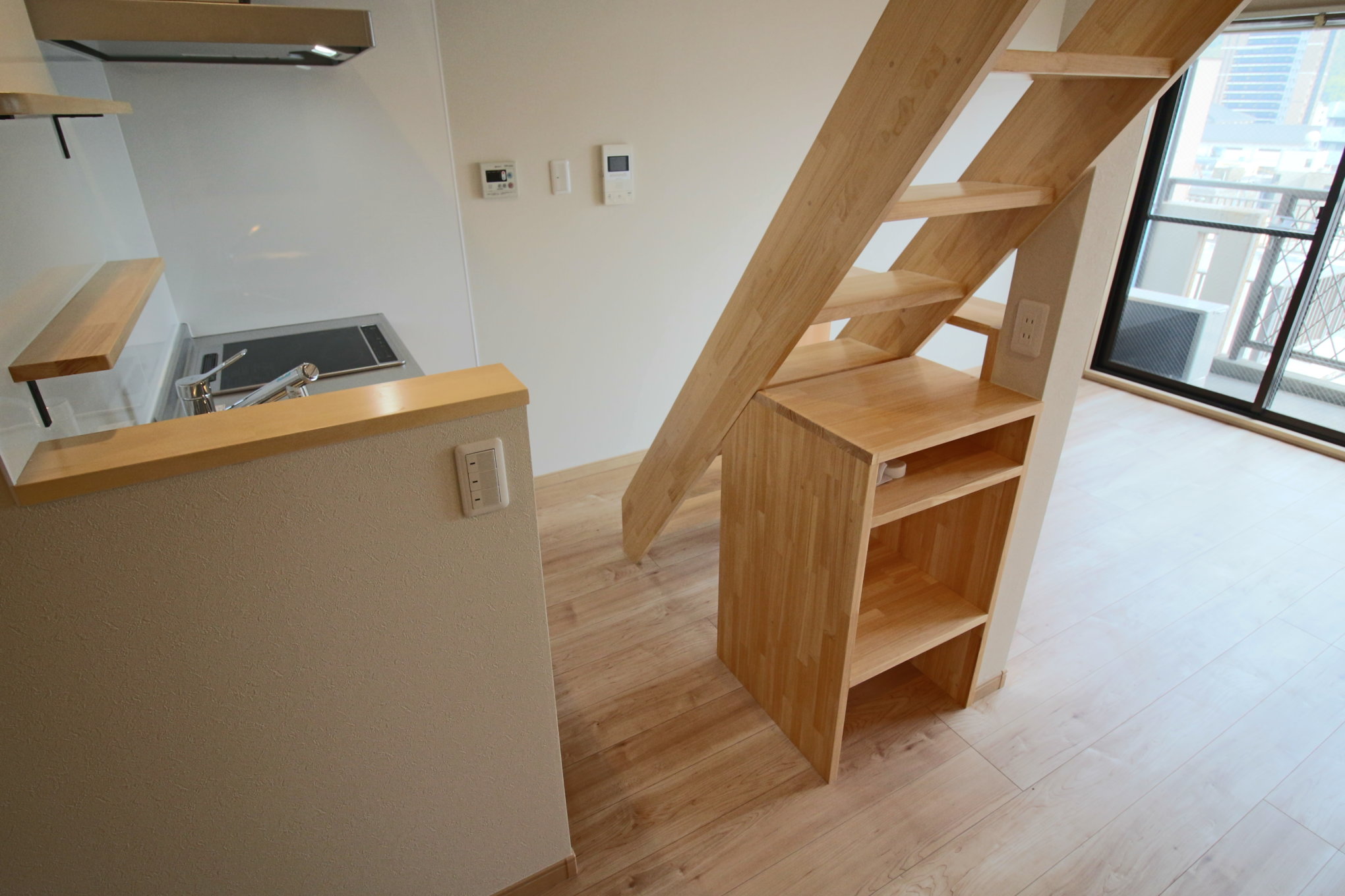 階段の位置はもともとのマンションの構造を大切にしながら、必要な広さや高さをしっかりと考慮した上で、キッチンの前に設けた。キッチン前に階段があると「動きにくいのでは?」と思う方もいらっしゃるかと・・・。