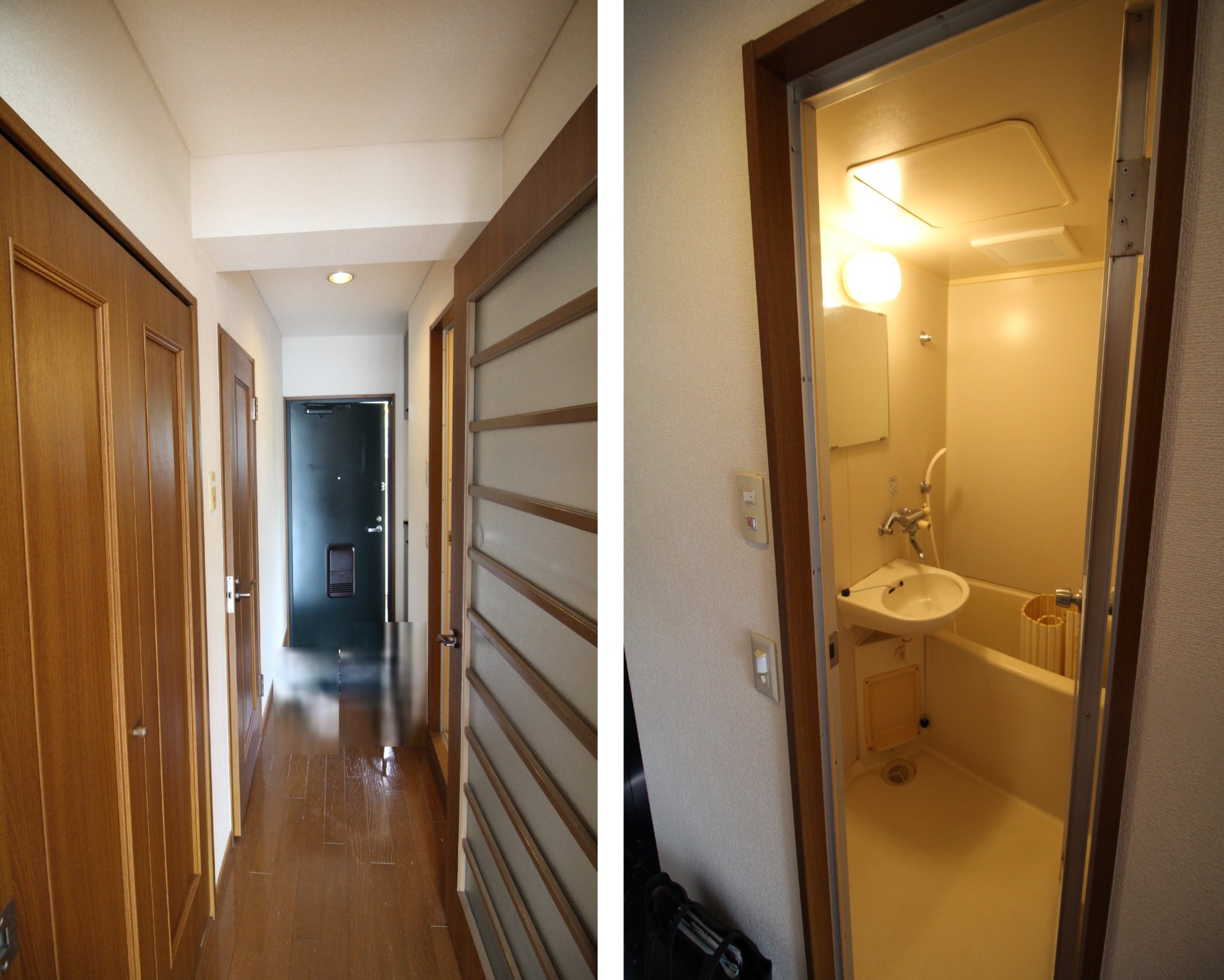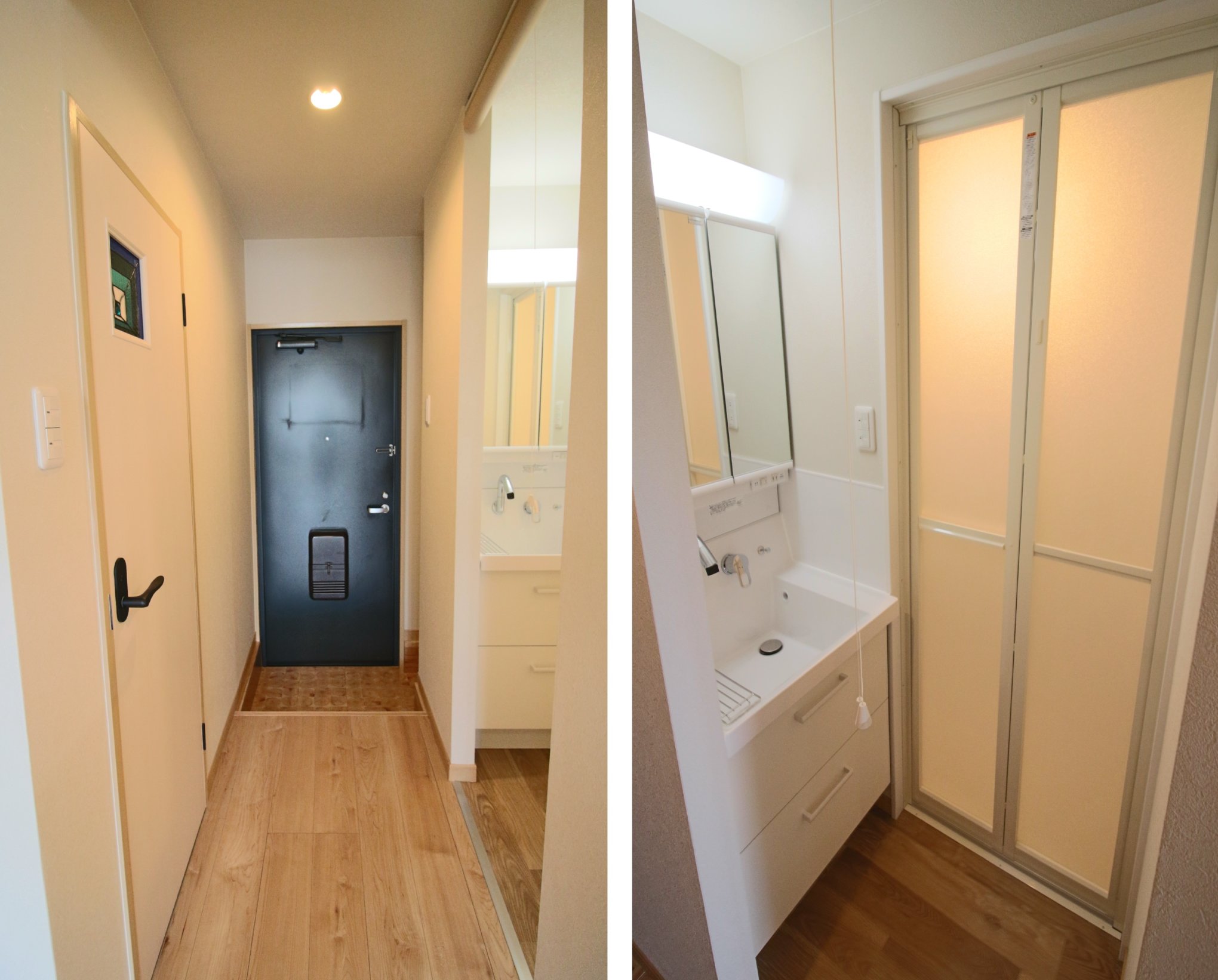 Beforeは洗面台とお風呂が一緒になっていた。Afterでは洗面所を設け、お風呂は浴槽無しのシャワーのみとなった。ここの部分についても、しっかりお施主様と打合せを行い、お施主様のニーズに合わせてリノベーションを行った。