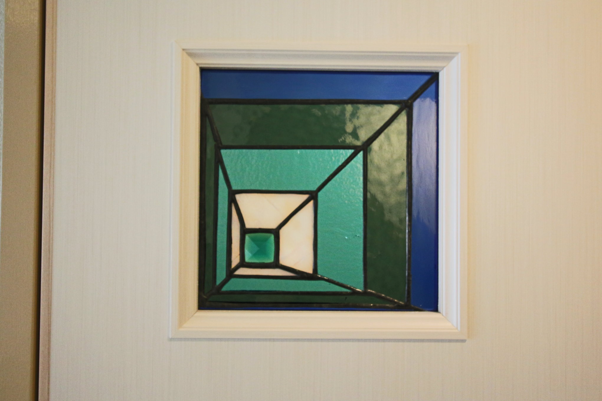 ステンドグラスは長崎の女性作家さんの作品。写真では分かりにくいが、ピラミッド型のビジューも使用されており、とても可愛いステンドグラスである。